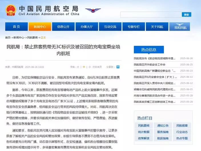 民航局發布緊急通知,自6月28日起禁止旅客攜帶無3C標識及被召回的充電寶乘坐境內航班。 民航局網站截圖