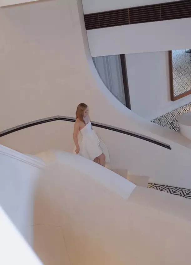 這襲看似簡約的白色晚裝實則暗藏「性感機關」,露肩設計突顯天鵝頸線條,高衩剪裁若隱若現秀美腿,緞面材質折射珍珠光澤,其中高炒角度的近距離照片,將其光滑細膩肌膚一覽無遺。
