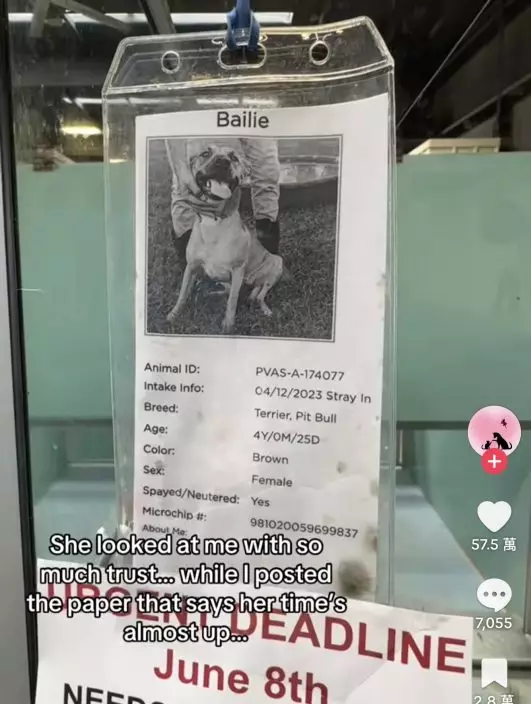 影片可見,狗狗「貝利」(Bailie)看見艾琳後便搖尾巴示好,並投以信賴眼神。艾琳表示,貝利來到收容所已近800日,自從進來後就再也沒有機會出去。由於已經成年,加上是比特犬,導致牠長期未受收養家庭青睞,「牠是一隻甜美又溫馴的狗狗,牠快沒有時間了,迫切需要一個家庭」。