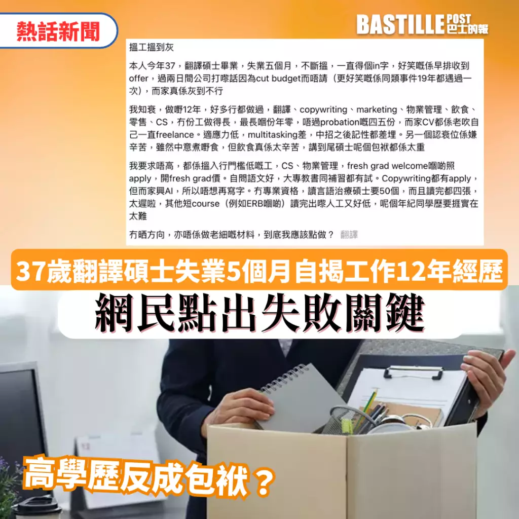 有名37歲的翻譯碩士在Threads發文,指自己見工只有面試機會卻未能成功就職,甚至獲聘後公司臨時取消錄用。他無奈表示「碩士這個頭銜反而成為沉重包袱」,引發網友熱烈討論。