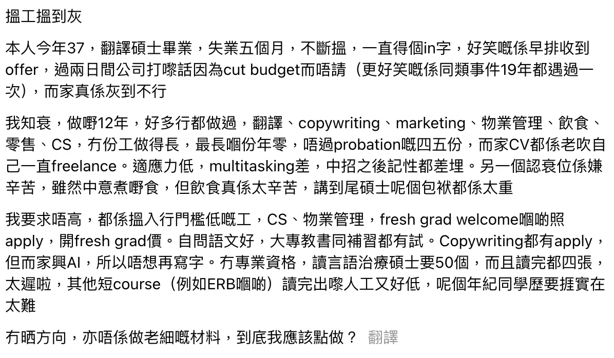 該名求職者詳細分享了自己曲折的職場經歷。擁有12年工作經驗的他,涉足過翻譯、撰稿、市場推廣、物業管理、餐飲服務、零售業及客戶服務等多個領域,卻始終未能找到長期穩定的工作。最長的一份工作僅維持約一年時間,更有四至五份工作未能通過試用期。如今在履歷上,他只能以「自由職業者」的身份來掩蓋頻繁轉換工作的紀錄。
