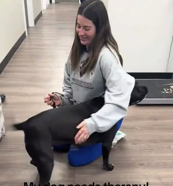 比特犬發現獸醫是飼主女兒既無措又驚喜。影片截圖