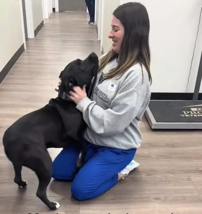 綜合外媒報導,國外一名飼主巴布(Bob Kuykendall)飼養了一隻比特犬「Cricket」。他介紹,Cricket外表看似兇悍,實則性格溫馴且膽小,尤為懼怕前往獸醫診所,每次看到醫生都會表現出緊張不安的情緒。近期,由於女兒剛成為一名獸醫,他突發奇想帶Cricket前去診所探望。由於未有事先告知Cricket,所以牠和以往一樣表現得很緊張,直至看見熟悉身影時才瞬間愣住。