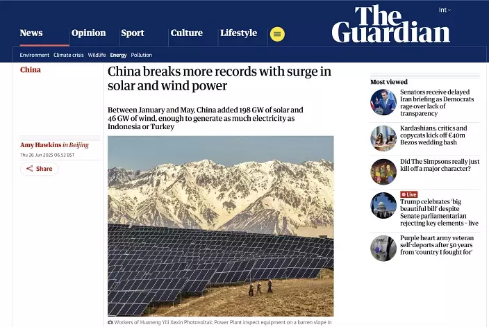 中國新能源發展規模飛速增長。據英國《衛報》6月26日報道,中國目前已擁有超過1000吉瓦(GW)的太陽能裝置容量,佔全球一半;而今年頭5個月,中國新增太陽能發電量達198 吉瓦,風力發電量 46 吉瓦,發電量相當於印尼或土耳其,其中單5月新增的風能和太陽能容量已相當於波蘭全國的發電量。《衞報》形容,這個世界第二大經濟體憑藉其快速建設的可再生能源基礎設施,創造了新紀錄。