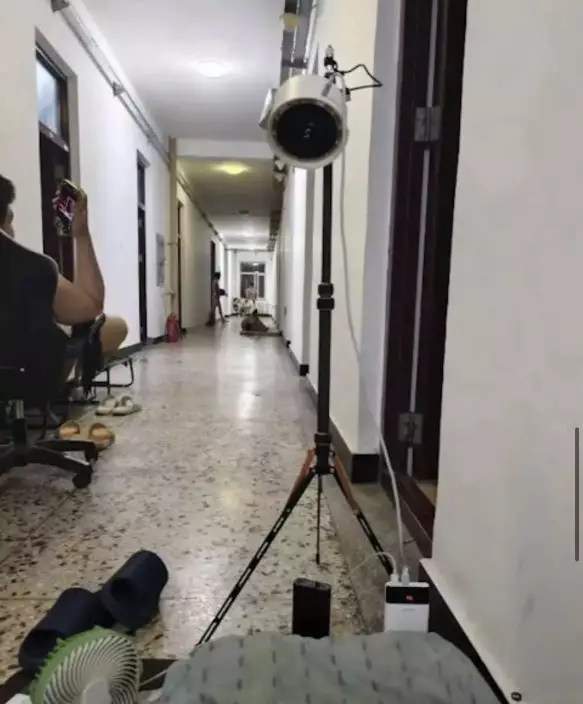 哈爾濱罕見高溫,大學生因宿舍無冷氣風扇樓道空地納涼「打地鋪」。影片截圖