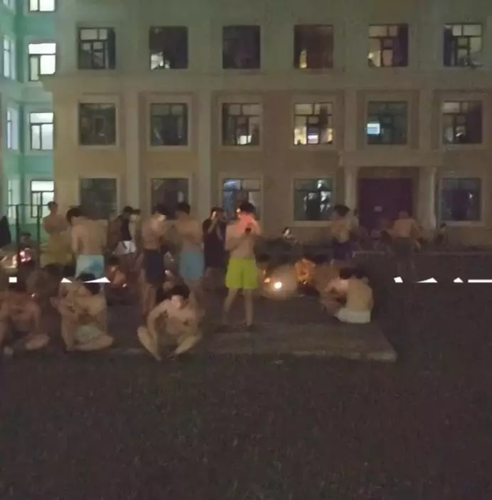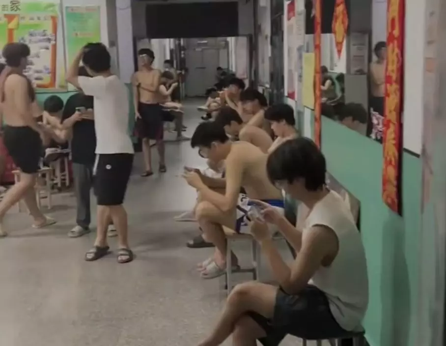 影片可見,多名穿着短袖短褲的男學生搬凳坐在樓道處納涼,也有學生在販賣機上購買冰凍飲品解暑,只見不少男學生甚至只著短褲、赤膊在宿舍樓下空地和樓頂天台鋪涼席睡覺。