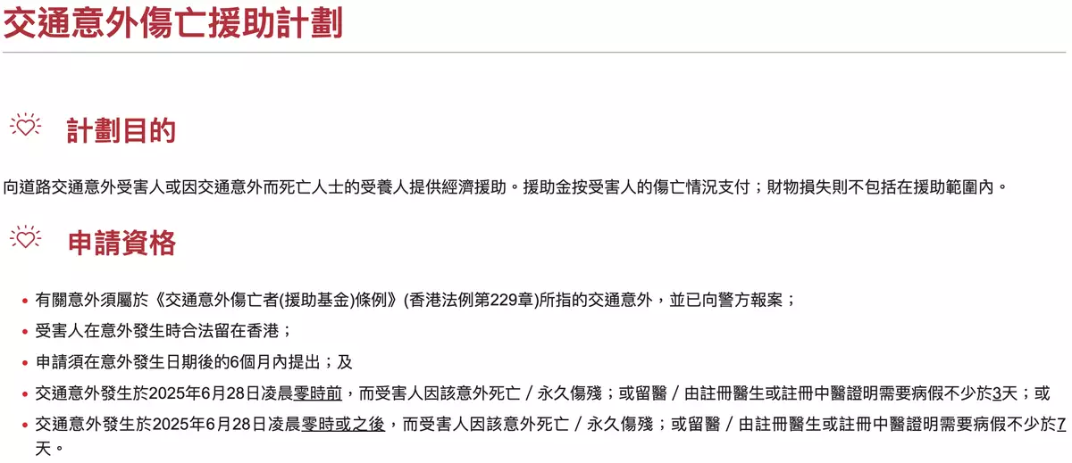 交通意外傷亡援助計劃。社會福利署網頁截圖