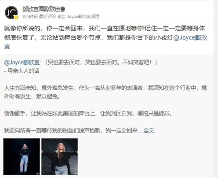 雖然復出計劃受阻,但欣宜鬥志未減,前晚(26日)10時許在社交平台發文,以「回鍋肉」自喻,表明決心重返舞台。她寫道:「喊都要面對,笑都要面對。不如笑住去啦!阿媽話齋,人生充滿未知,意外難免。」她坦言作為資深表演者,明白行業風險,但仍感激《歌手》讓她重拾舞台感覺,「多謝呢個舞台令我搵返自己,哪怕只係綵排」。文末更向粉絲承諾:「同一直等我嘅粉絲講聲對唔住,我一定會返嚟!#回鍋肉#」帖文一出,大批網民留言打氣:「健康最緊要,我哋等你歸來!」