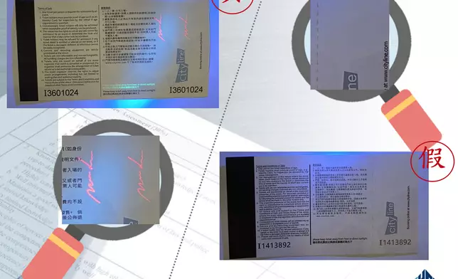 陶又指,是案檢獲的門票印刷質素比警方較早前檢取的較參差和劣質,票面中也發現了一些明顯可以分辨到真假門票的特徵,包括字型不公整、鐳射防偽標籤較粗糙和深色;門票和票尾中間的切割位較突出和粗糙;票尾背頁真門票印著「Terms and Sales」 假門票印着「Terms and Conditions of Sales」;真門票銷售條款中英文版共有10項,假門票則有11項,而該批次假門票編號俱為「I1413892」等等。