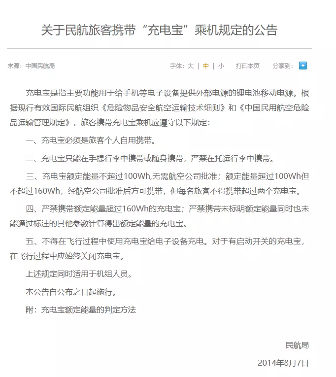 中國民航局發出的關於充電寶上機標準的公告。圖片來源:中國民航局官網