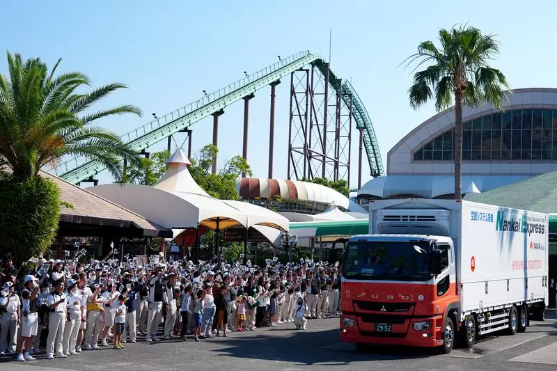 工作人員與民眾,在日本和歌山縣冒險世界遊樂園目送接戴大熊貓的卡車離開。新華社圖片