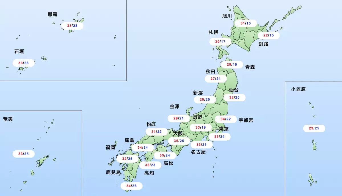 日本廣泛地區天氣酷熱,廣島縣安藝太田町氣溫高達攝氏36.4度。東京市中心33.8度,大阪市33.5度。