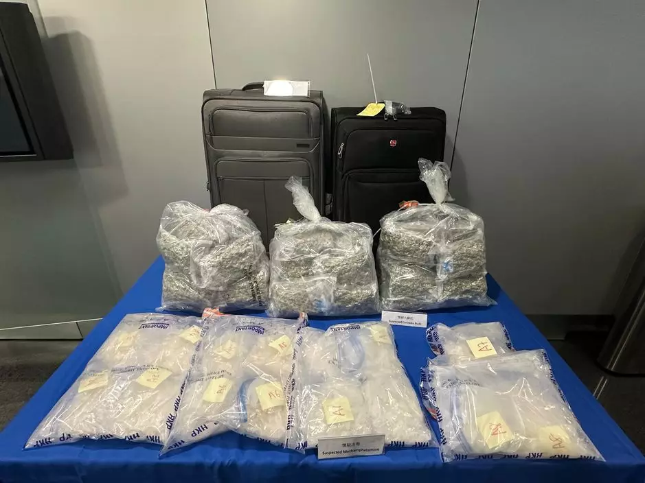 警方在女子行李中分別發現8包共重約15公斤的疑似冰毒,以及約16公斤的疑似大麻花。