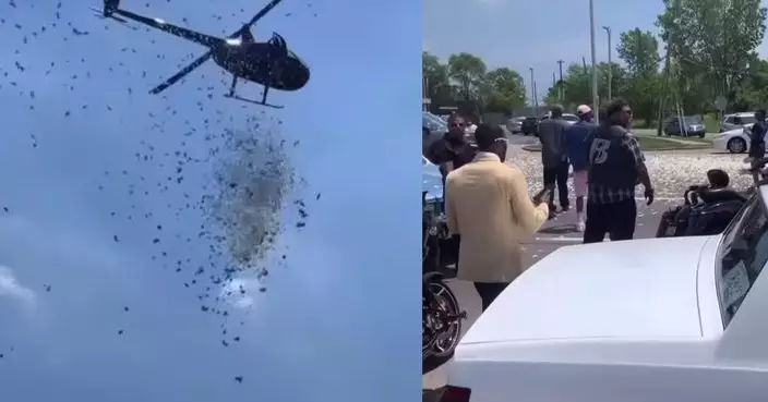 美國底特律市區上演「撒錢秀」,直升機狂撒5000美元鈔票引路人瘋搶,背後藏感人遺願。影片截圖
