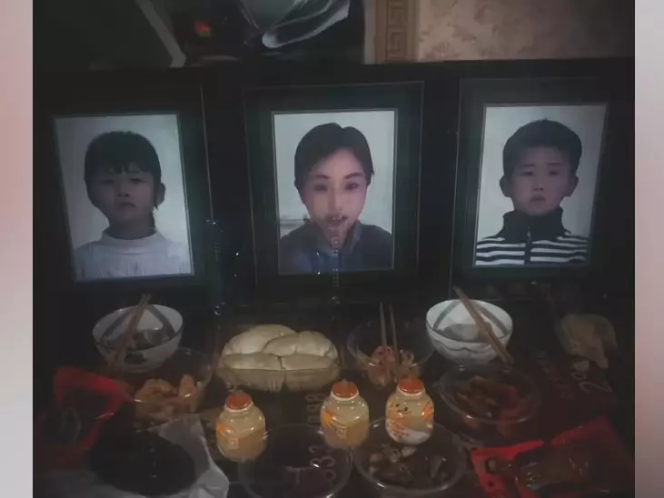 三名死者的遺照擺放於靈堂前,家屬為其設置祭品悼念。網上圖片