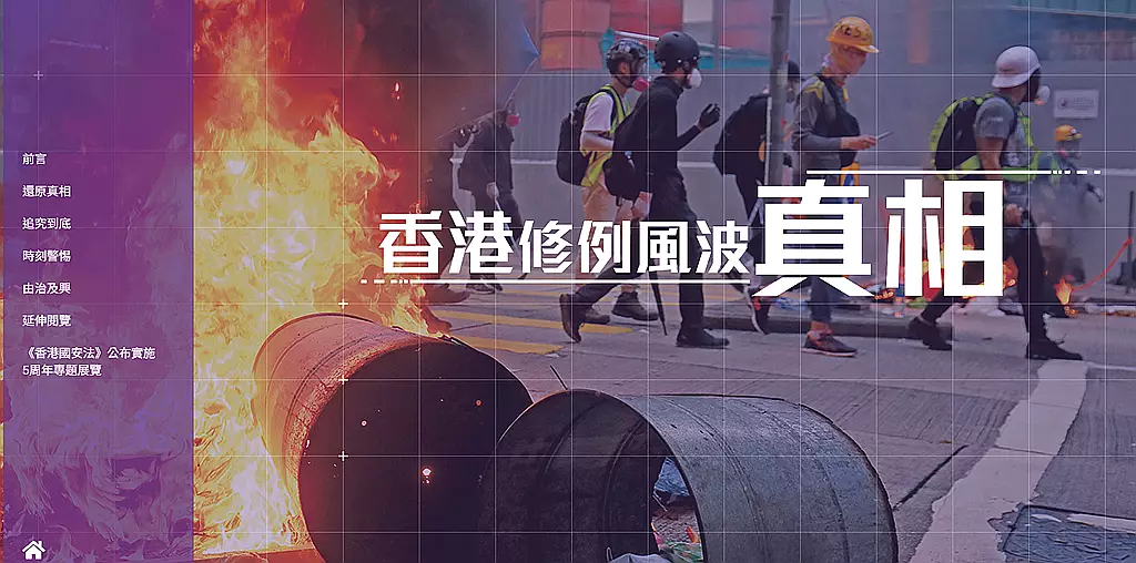 其中,「前言」部分指,「修例風波」是香港歷史上永遠抹不去的傷疤,是「懸在我們頭上時時敲響的一口警鐘」,故網站旨在提供有關香港「修例風波」的真實資料,藉此警醒大家必須牢記「修例風波」的慘痛教訓。