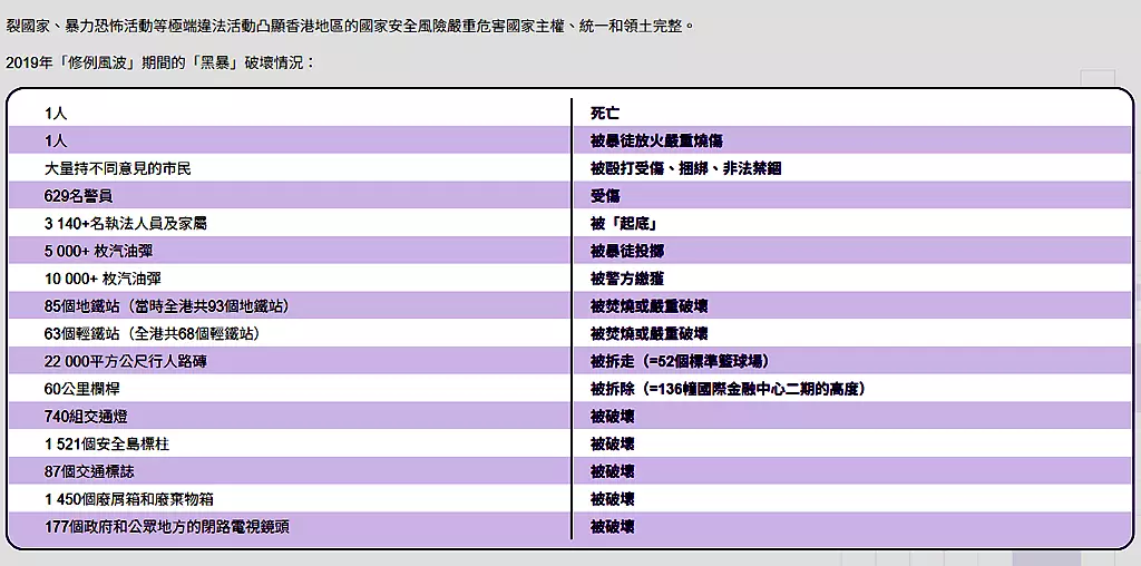 網站亦「點算」了修例風波期間,本港遭受的破壞情況及人命傷亡,包括1人死亡(七旬清潔工羅長清頭部中磚身亡)、1人被放火嚴重燒傷(馬鞍山李伯被人淋潑易燃液點火至危殆)、大量持不同意見的市民被毆打、捆綁或非法禁錮、629名警員受傷、3140名以上的執法人員及家屬被「起底」、暴徒投擲了5000枚以上的汽油彈、警方繳獲的則逾1萬枚,85個地鐵站(佔當時全港逾91%)及63個輕鐵站(佔全港約93%) 被焚燒或嚴重、2.2萬平方公尺行人路磚(相等於52個籃球場)及60公里欄桿(相等於136幢國際金融中心二期的高度)被拆除;還有740組交通燈、1521個安全島標柱、87個交通標誌、1450個廢屑箱和廢棄物箱及177個政府和公眾地方的閉路電視鏡頭被破壞。