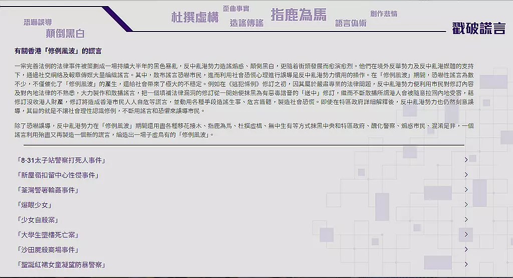 另「戳破謊言」部分,更羅列了在修例風波期間所催生的恐嚇性謠言和誤導,以各種移花接木、指鹿為馬、杜撰虛構、無中生有等方式的抹黑和醜化,煽惑市民、混淆是非,編造出一場「子虛烏有」的「修例風波」。