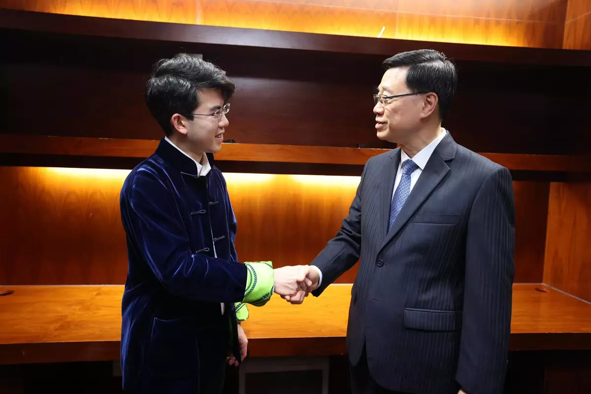 沈靖韜在「星耀紫荊慶回歸」晚會上演奏,並與李家超握手。李家超FB圖片