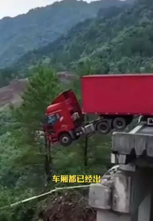 綜合內媒報導,貴州G76廈蓉高速三都縣段猴子河特大橋於6月24日清晨突發嚴重垮塌,一輛江西牌照的紅色貨車恰好駛經至斷裂處,衝出橋面車頭懸掛在斷橋邊緣搖搖欲墜,下方是百米深谷,司機游師傅被困駕駛室,緊急踩死煞車防止墜落,情勢十分危急。