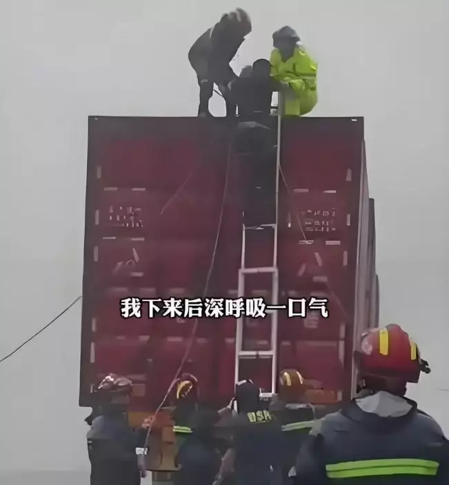 救援隊隊長攀爬貨車頂部 架設逃生梯救出司機