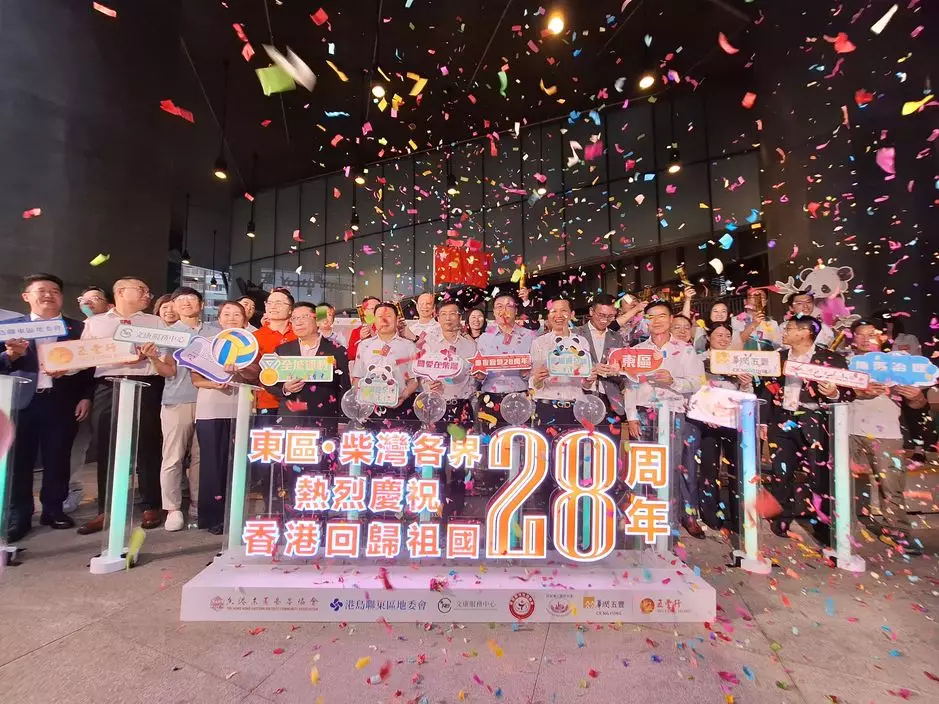 柴灣青年廣場星期二(7月1日)下午隆重舉行「慶祝香港回歸祖國28周年東區柴灣惠民系列活動啟動禮」 暨 「熊貓迎全運 關愛在柴灣」亮燈儀式。此活動由香港東區各界協會、香港島各界聯合會東區地委會、文康服務中心、香港柴灣社團聯會、筲箕灣社團聯合會、五豐行等機構合辦,旨在為民服務與關懷社區。盛事吸引了眾多東區市民參與,共同慶祝這一重要的歷史時刻。