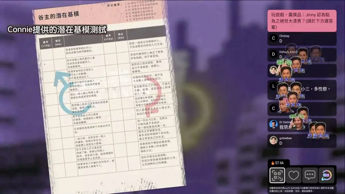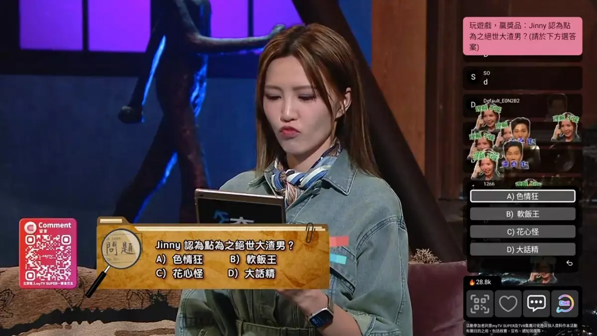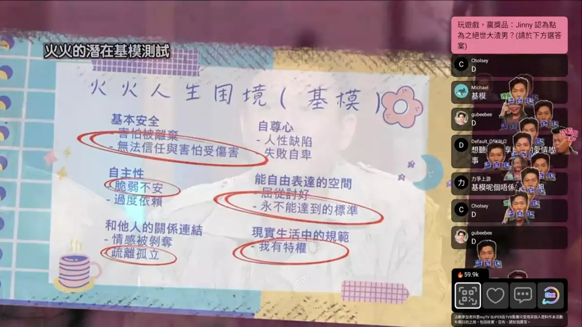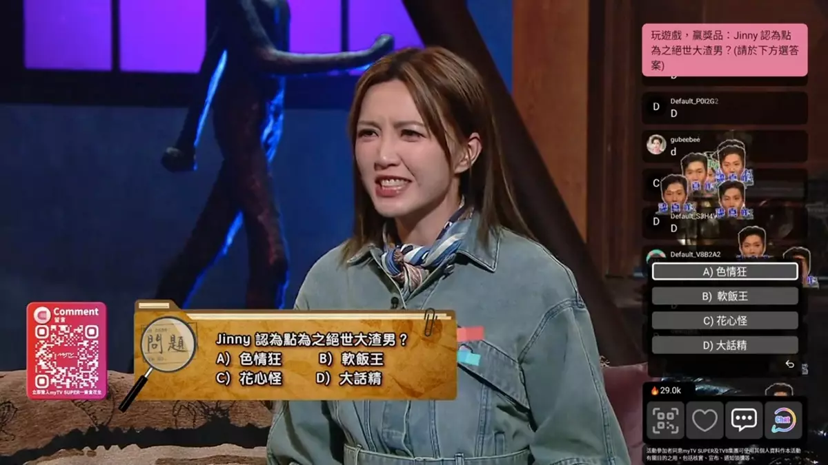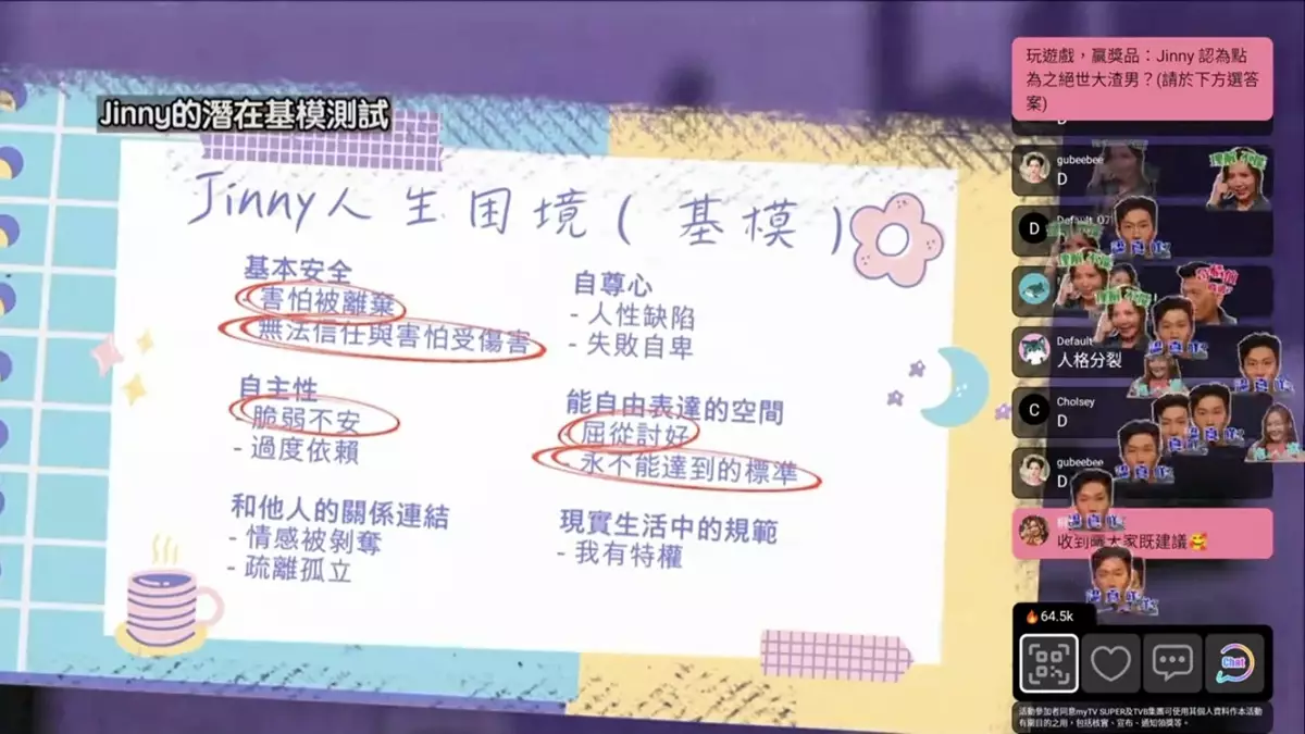Jinny在測試中是唯一具備「屈從討好」性格,跟她表現出的強悍作風大不相同,她語帶震驚的說︰「即係我某程度係『M底』?令我好surprise,我成日以為係『S底』。」火火笑言千萬不要讓Jinny老公知道。到遊戲環節火火讀出當晚問題「認為點為之絕世大渣男?」,並提供4個選擇答案︰A.色情狂、B.軟飯王 C.花心怪 D.大話精,作答的吳若希(Jinny)竟毫不猶疑講出答案︰「我最憎最憎最憎啲人講大話。」火火亦被Jinny的直白嚇親,帶點無奈說︰「呢個貼士真係好明顯喎,明顯到咁得唔得㗎?唔知仲有無人估錯,次次講到好明顯都有人估錯。」Jinny此舉擺明隔住螢幕跟老公何兆鴻耍花槍。