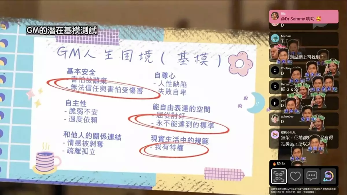 Connie講解討好型人格(M底)及「最危險情人」的邊緣型人格障礙症(BPD),又為3位谷主進行「基模測驗」,分析他們所屬人格中的缺失。Connie解釋何謂「M底」時說︰「日常生活例子,就好似你叫咗杯凍檸茶,嚟咗杯凍檸水喎,有討好型人格就會覺得唔緊要啦,都係『檸』啫飲咗佢算啦。想please全世界嘅人,好驚人唔鍾意佢,所以好多嘢都屈就咗。」