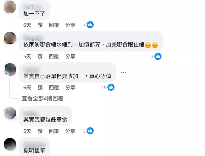 不少留言都認同事主,紛紛表達對加一服務費的不滿,「而家自助落單,有啲連倒水都自助,但加一照收」、「自己落單但要收加一,真心唔值」、「加一又叫服務費,請問你服務咗我啲咩?拎個餐比我呀?」、有網民甚至覺得應取消加一服務費這制度「取消加一!會更加吸引!」