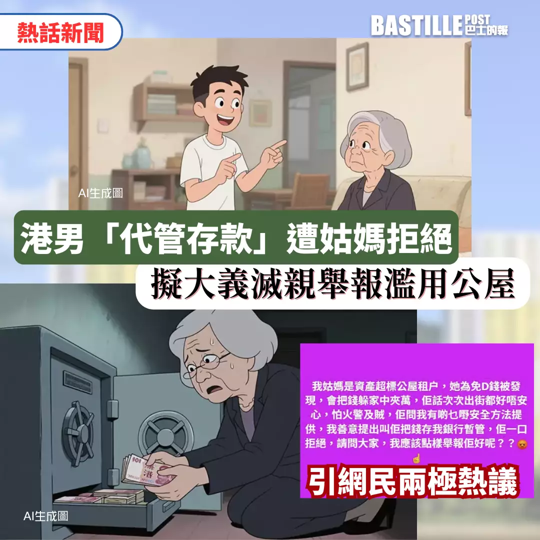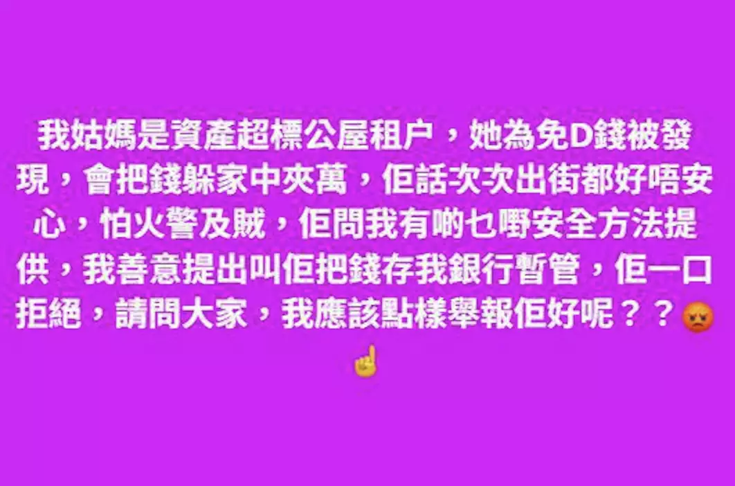 該男子稱,姑媽為避免被房屋署查獲,將現金存放於家中夾萬,但因此終日提心吊膽,擔心遭遇火警或盜竊。他更透露曾「善意」建議姑媽將錢款暫存其銀行帳戶,但遭拒絕後決定「大義滅親」,並詢問網民「我應該點舉報佢好呢?」。