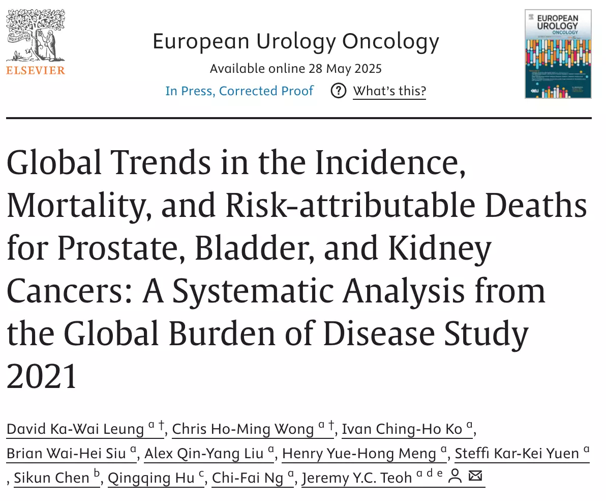 團隊就全球前列腺癌、膀胱癌及腎癌的發病率與死亡率,進行長達20年數據分析,結果顯示3種癌症在全球共錄得約225萬宗新病例及超過81萬宗死亡病例,其中前列腺癌發病率升幅最高。研究結果已刊載於國際權威期刊《European Urology Oncology》。