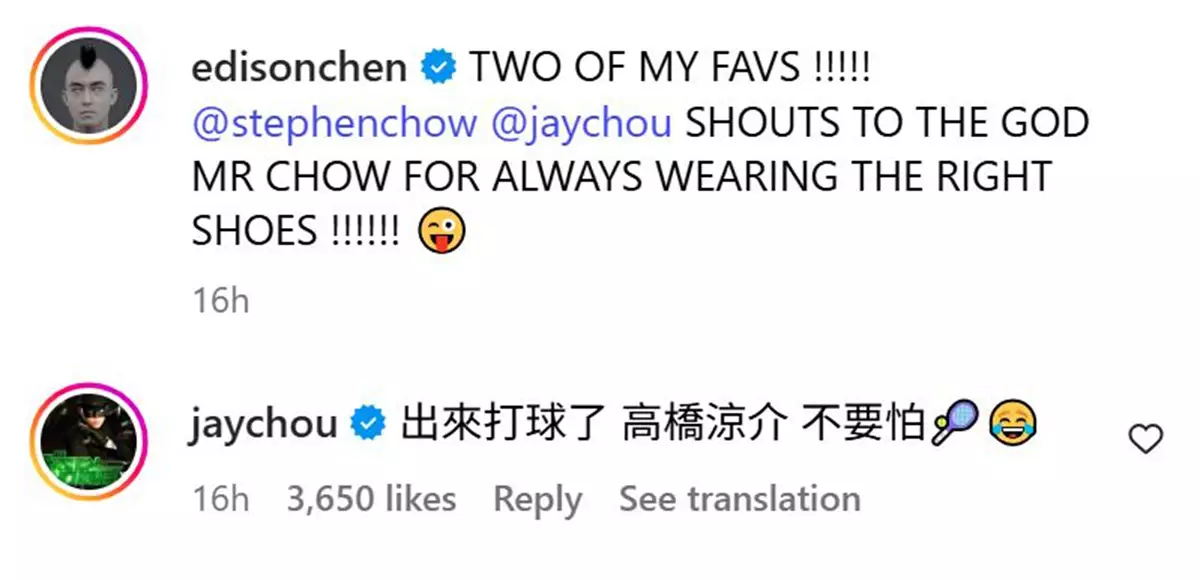 此外,周星馳與周杰倫的合照亦被陳冠希轉發,指二人是他最喜歡的人,更是他心目中的「神」,又大讚二人「著啱鞋」,因為二人腳上的鞋均出自其自家品牌。周杰倫就以昔日二人合作電影《頭文字D》角色名稱留言:「出來打球了,高橋涼介,不要怕!」