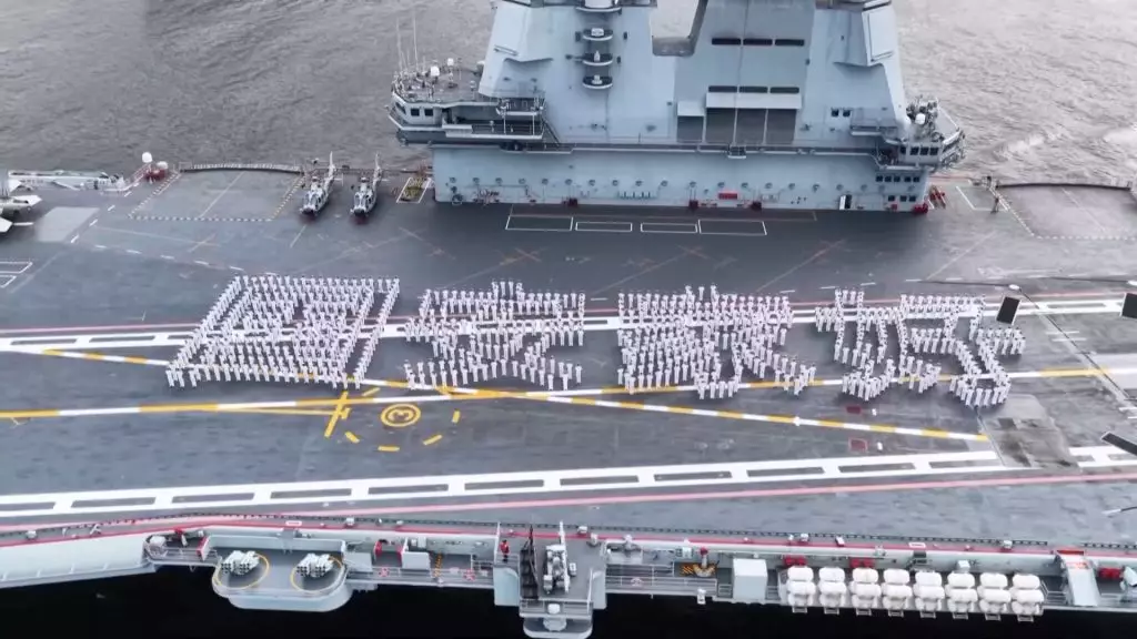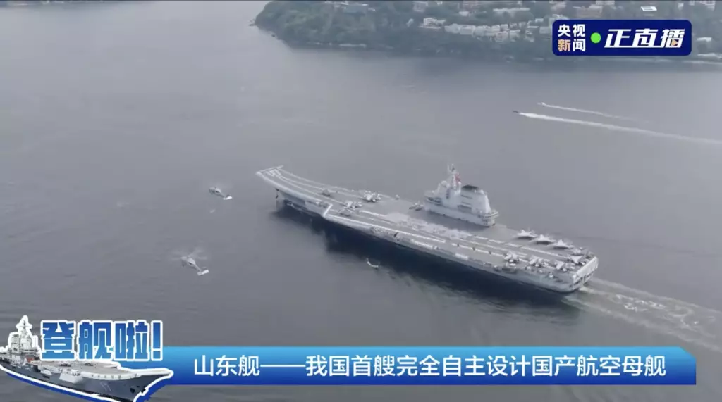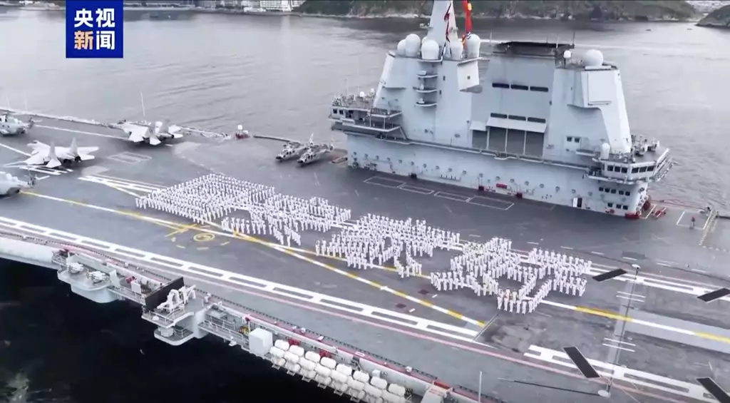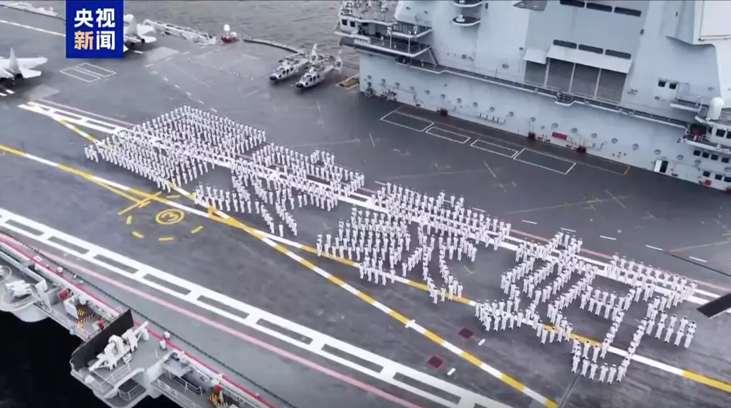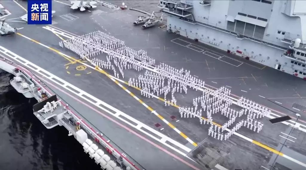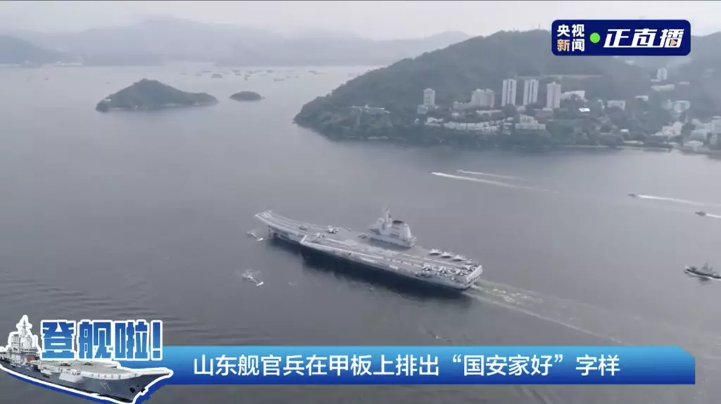山東艦訪港,官兵甲板列隊「國安家好」方陣。央視新聞截圖