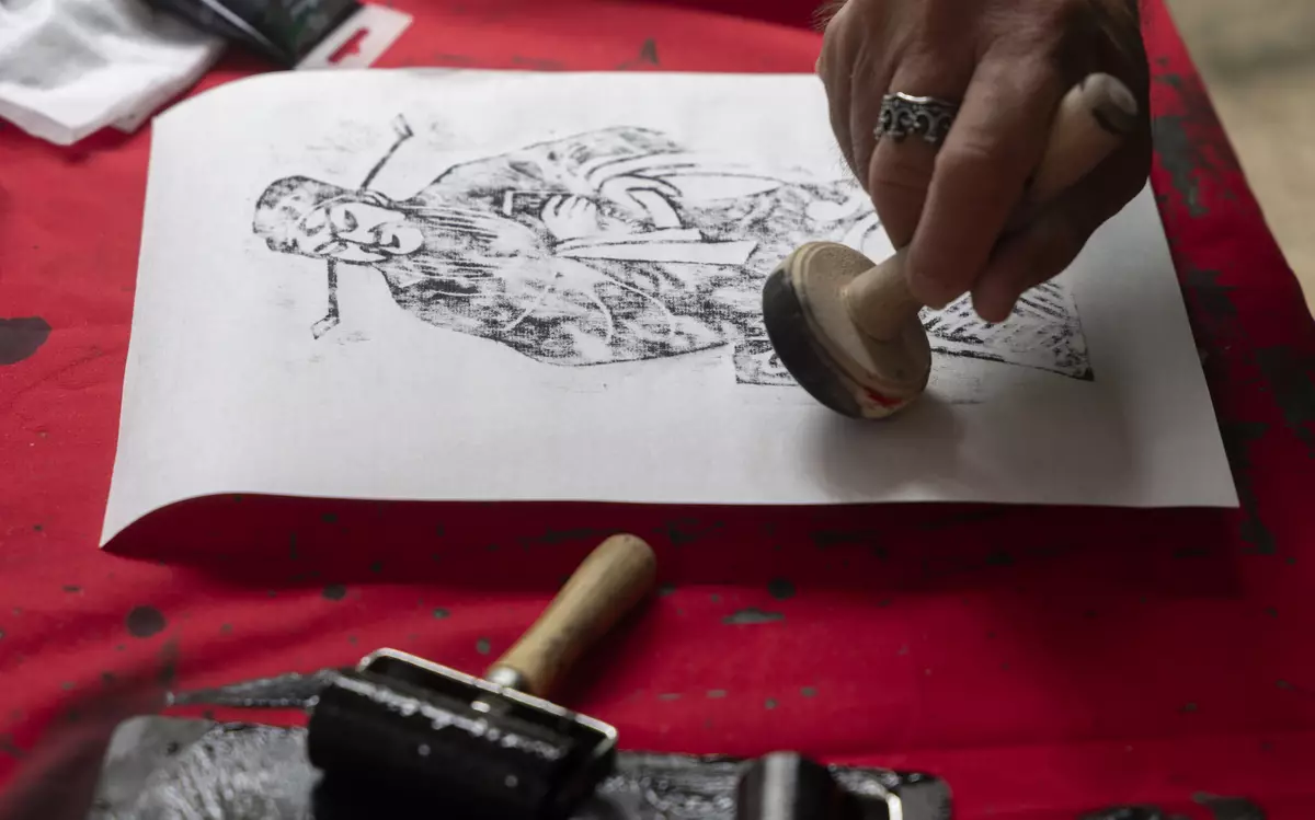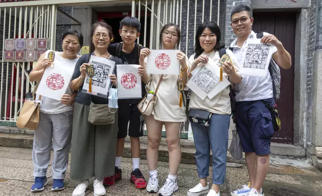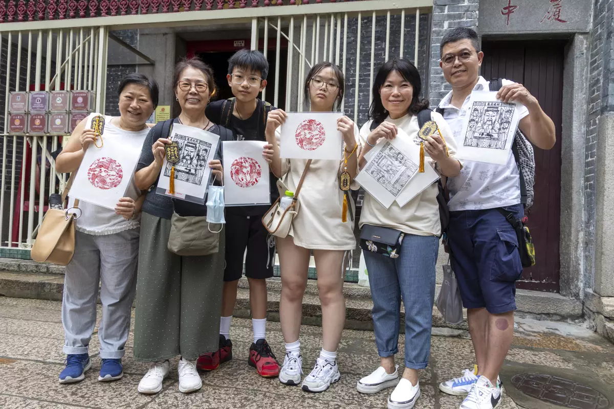移居台灣多年的周老太(左二)指,因家人官司纏身,聽聞拜包公可祈求官司順利,特意與子女和孫兒總動員到文武廟求包公籤,希望打贏官司。在台灣任職中文科老師的周小姐(右二)則大讚包公誕活動有意義,十分喜歡製作木刻版畫的攤位遊戲,認為有助兒子認識歷史文化。