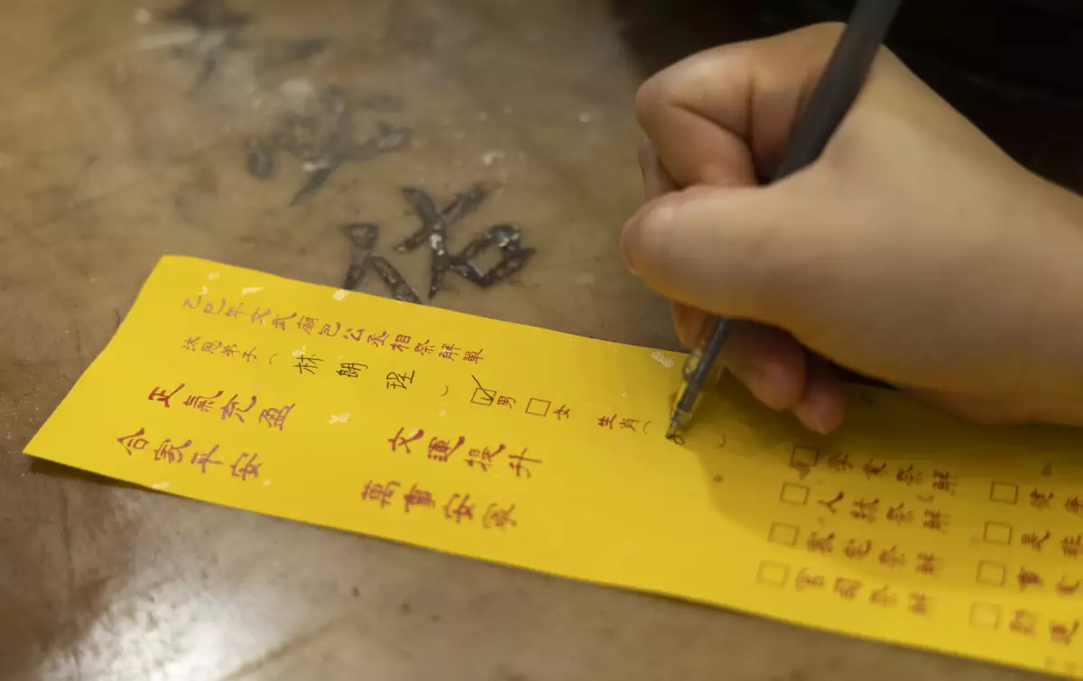 1.在解單上填寫姓名、生肖等資料,解單下方有多個祭解選項如「官司祭解」、「家宅祭解」、「學業祭解」、「事業祭解」、「健康祭解」、「是非祭解」等,讓善信按自身需要剔選。