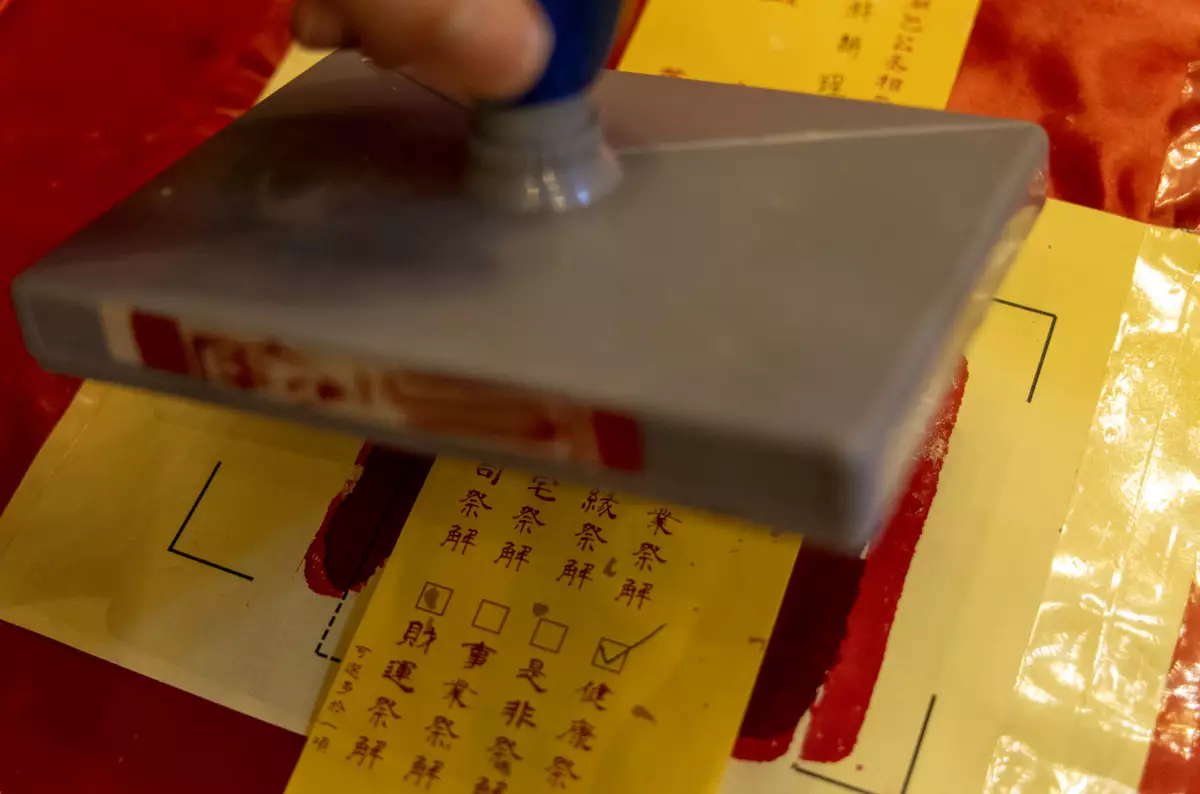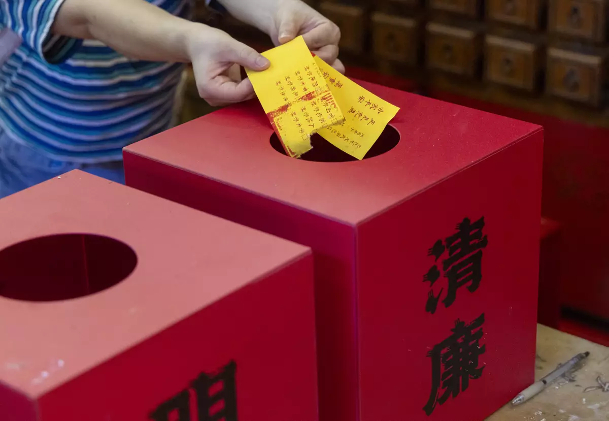 5.將鍘開的祭解單放入寫有「公平」、「正直」字句的祭解箱,便完成整個儀式。