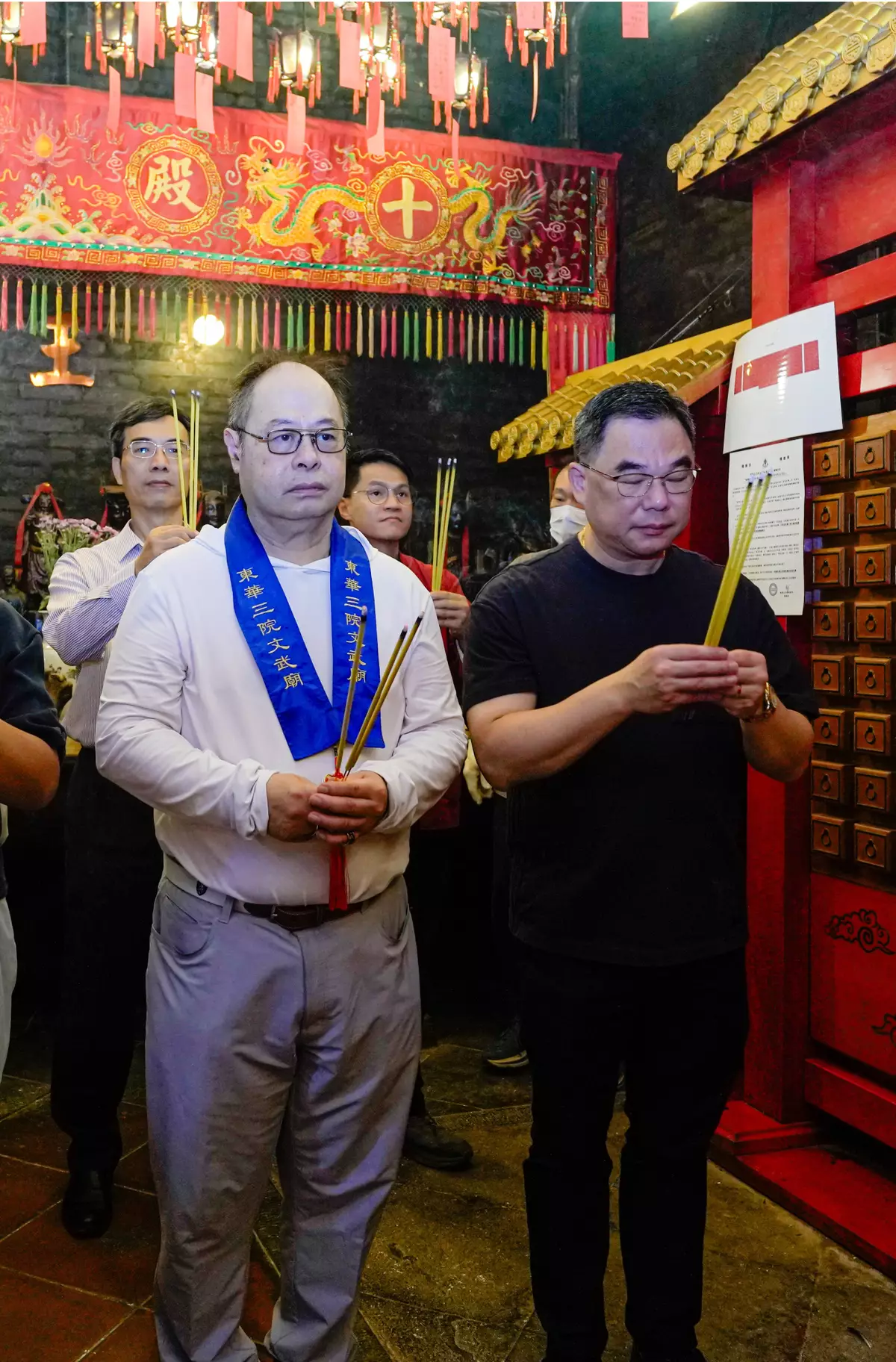 主禮嘉賓東華三院庚申年總理楊國佳先生(左)及行政總監蘇祐安先生(右)向東華三院文武廟包公丞相神像行敬神禮。