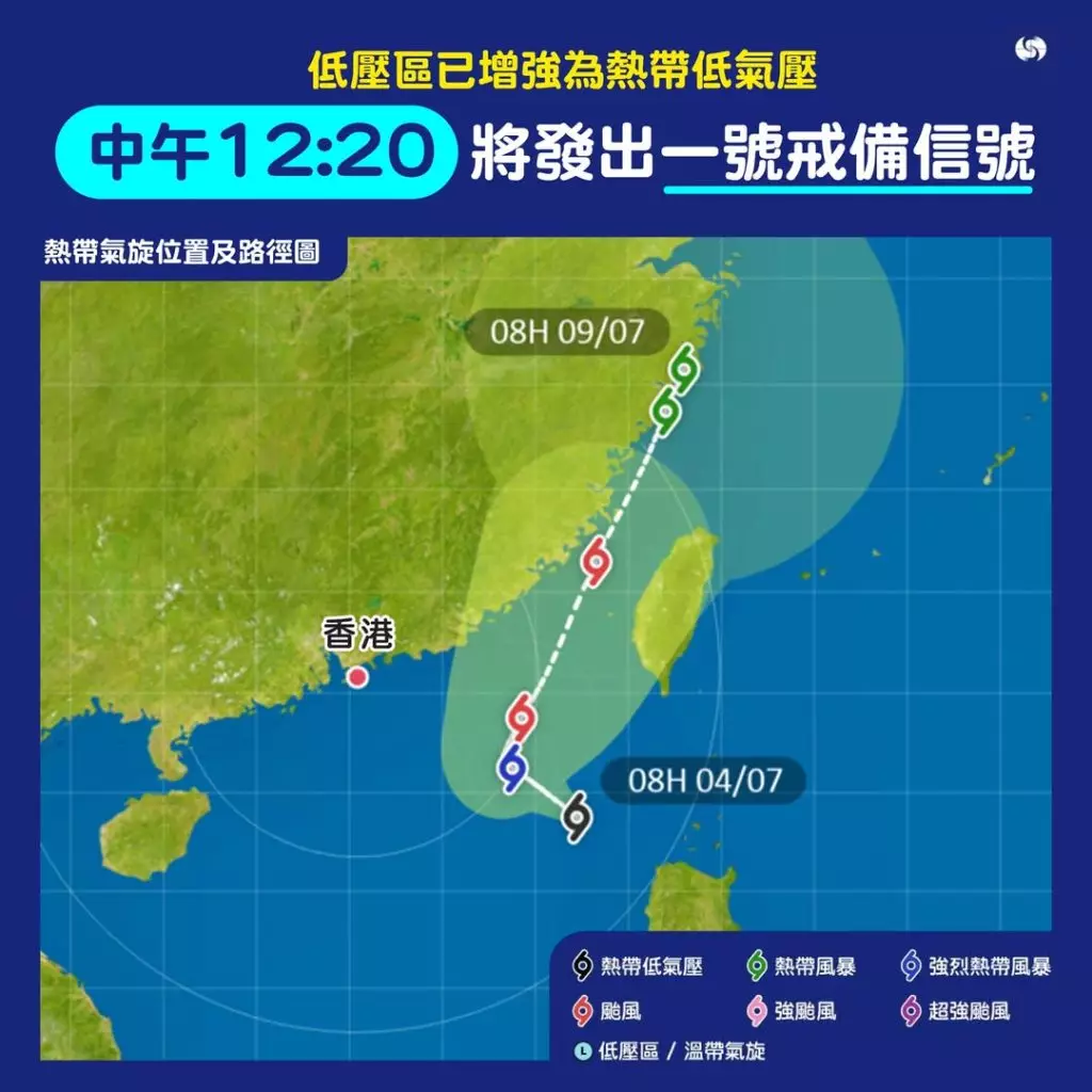 天文台表示,位於南海東北部的低壓區已增強為熱帶低氣壓。天文台會在星期五(7月4日)中午12時20分發出1號戒備信號。