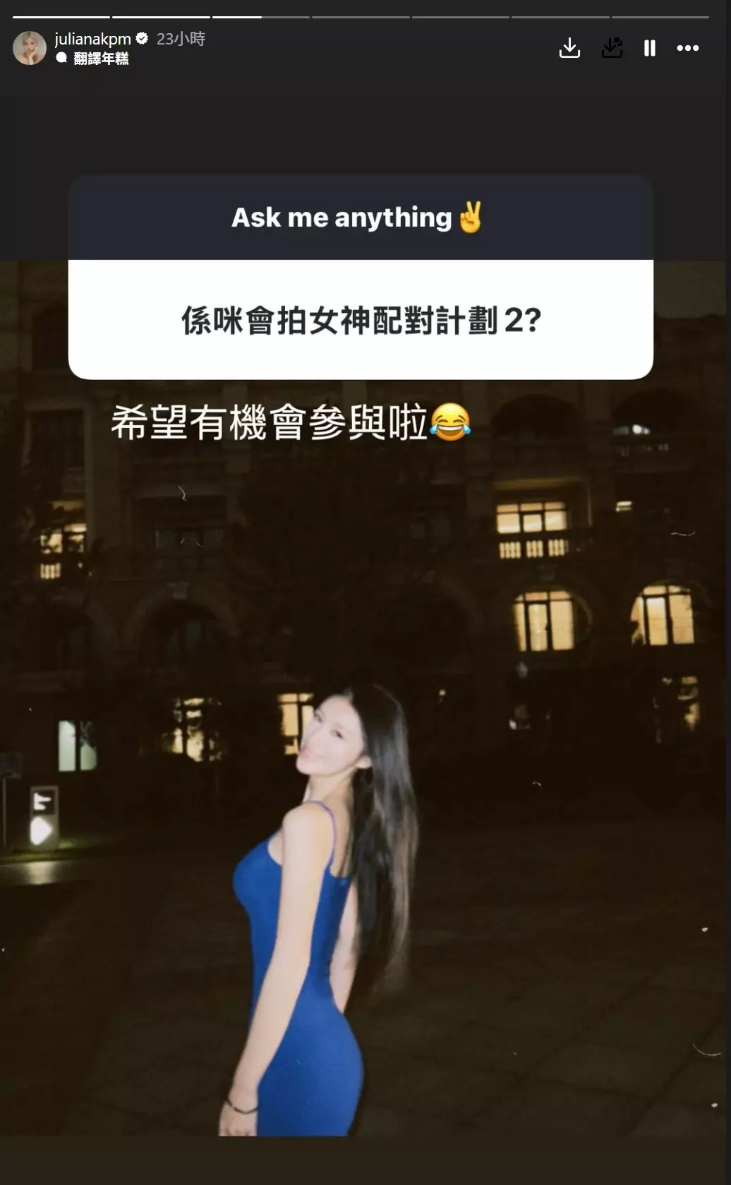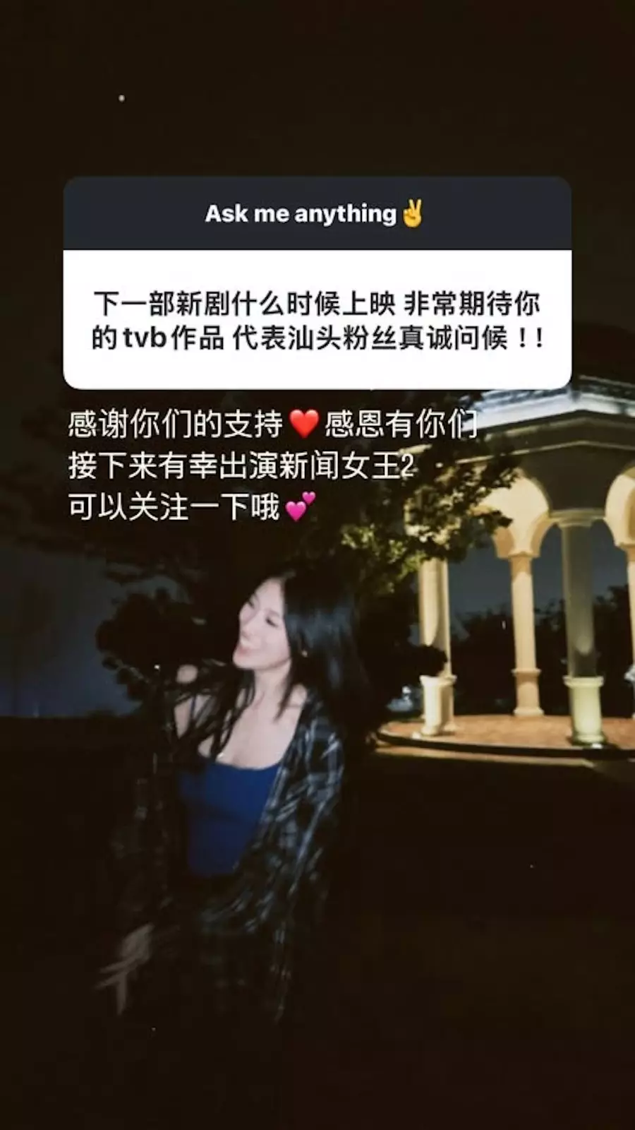郭珮文近日在IG Story與網民玩「你問我答」,近期戀愛綜藝真人騷《女神配對計劃》正在熱播,有網民就問她:「係咪會拍《女神配對計劃2》?」郭珮文直言:「希望有機會参與啦。」又有網民問:「下一部新劇什麼時候上映?非常期待您的tvb作品,代表汕頭粉絲真誠問候!!」郭珮感謝對方的支持,「感恩有你們!接下來有幸出演 《新聞女王2》,可以關註一下哦。」