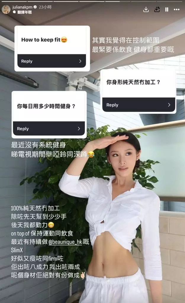 此外,如果練成「最強Body」亦是不少網民好奇的問題,郭珮文表示:「其實我覺得在控制範圍,最緊要係飲食, 健身都重要嘅」,但亦坦言最近都没有系統健身,但會在看電視期間舉啞鈴和深蹲。有網民更問:「你身形纯天然冇加工?」郭珮文就表示:「100%純天然冇加工,除咗先天幫到少少手,後天我都勤力。on top of保持運動同飲食,最近有持續做 @beaunique_hk嘅SlimX。好似又瘦咗同firm咗,佢出咗八成力, 我出咗兩成,呢個身材佢絕對有份做成!」