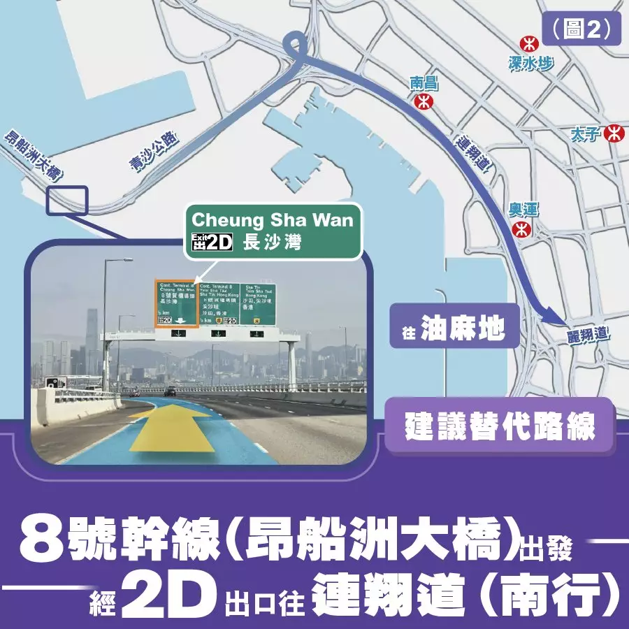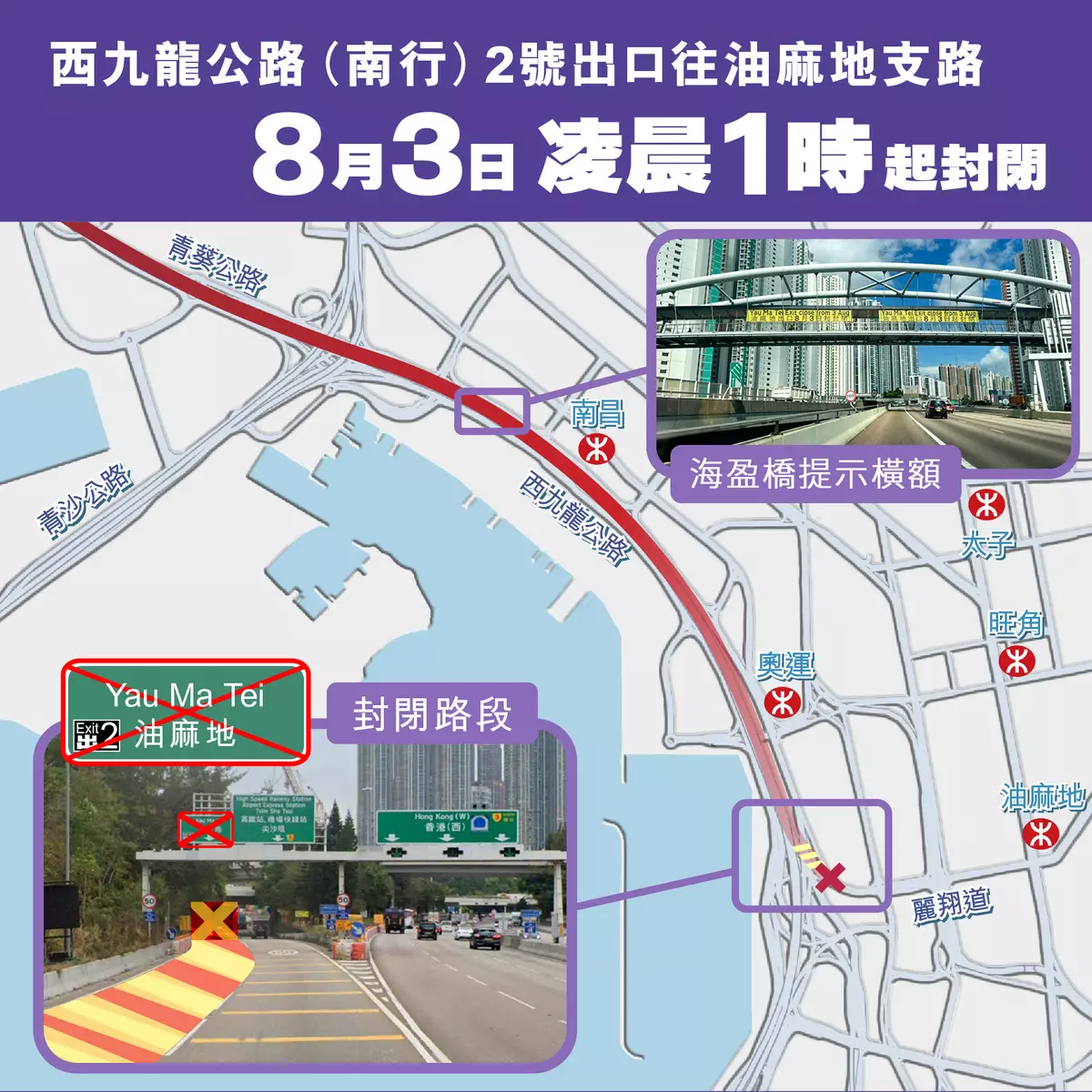 署方在社交專頁說,由於西九龍公路南行2號出口前往油麻地的支路,將改建為中九龍繞道(油麻地段)的入口,原有經該出口及支路前往油麻地的車輛,自下月3日凌晨1時起需改經連翔道。