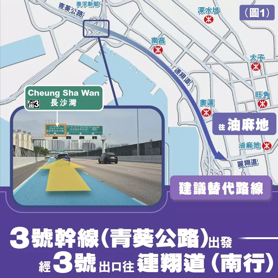 路政署表示,為配合中九龍繞道(油麻地段)入口建造工程,西九龍公路南行方向前往油麻地,下月3日起需改經連翔道。