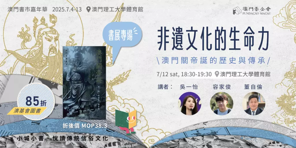 「第二十八屆澳門書市嘉年華」在7月4日至13日期間於澳門理工大學體育館舉行,澳門基金會已連續多年參展,今年續於現場展出數百種圖書,並推出85折購書優惠,以饗讀者。書展期間,將舉辦「非遺文化的生命力」講座,邀請「澳門關帝誕」作者吳一怡、容家俊、董自倫三位主講,共話澳門關帝文化傳承發展,歡迎市民參與。
