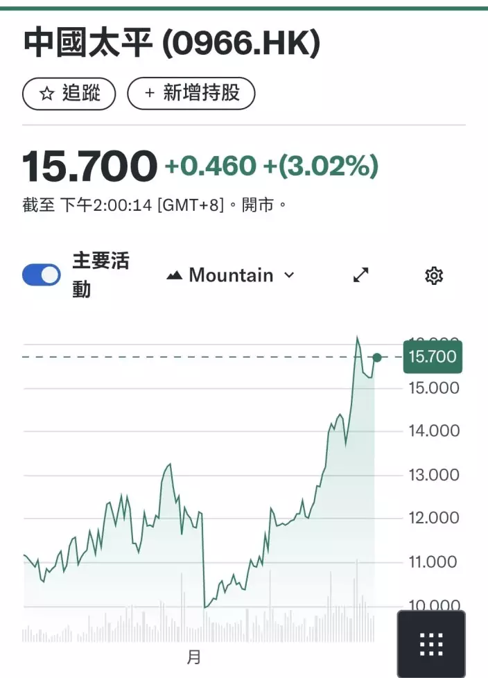 中國太平好多因素都好,唯一唔好是股價已升了上去,中信建投、星展等維持 中國太平「買入」評級,目標價分別為 16.14元和 17港元,現在差不多到價。