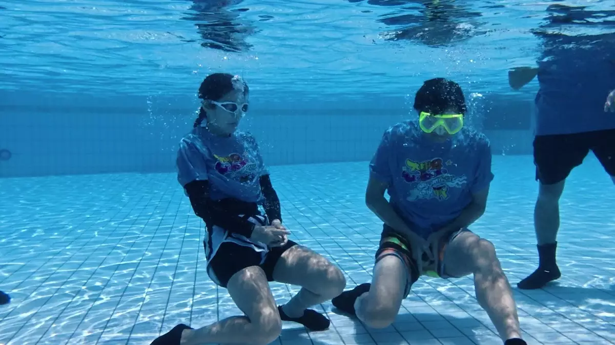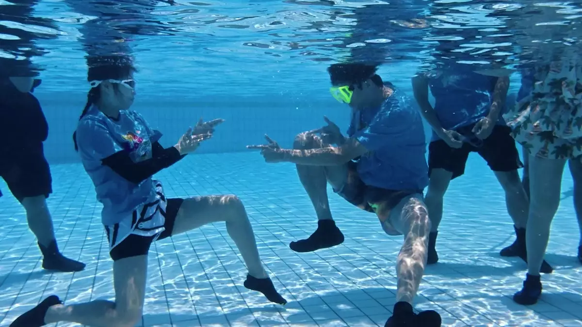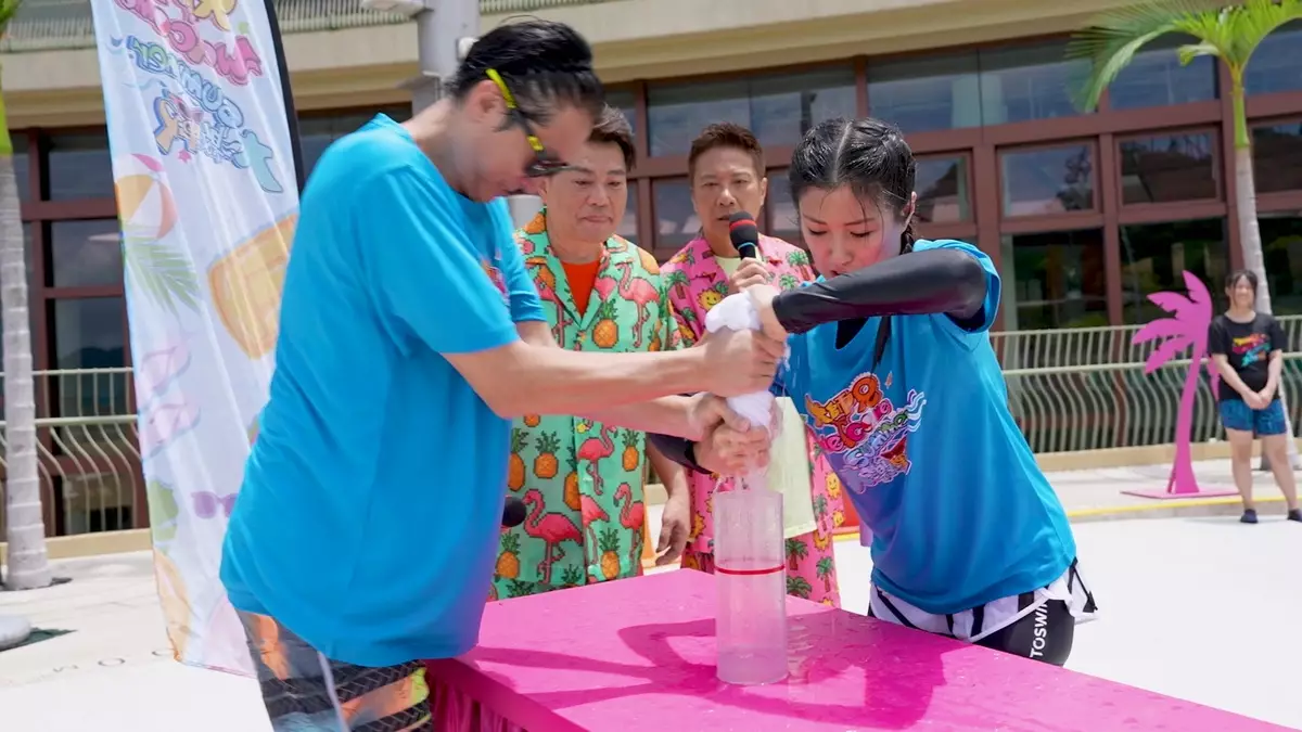 洪天明 周家蔚於「水中大電視」環節中 默契十足做出「心口碎大石」、「打尿震」、「槍戰」等高難度動。