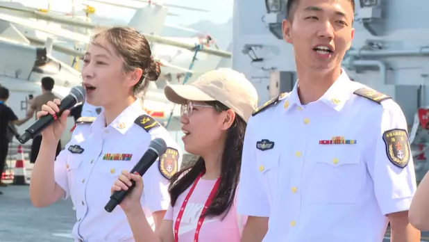 訪港的航母山東艦,開放予成功預約的香港市民參觀。市民登艦後可參觀各種武器裝備,與停泊甲板上的戰機打卡,並與軍樂隊合唱愛國歌曲。