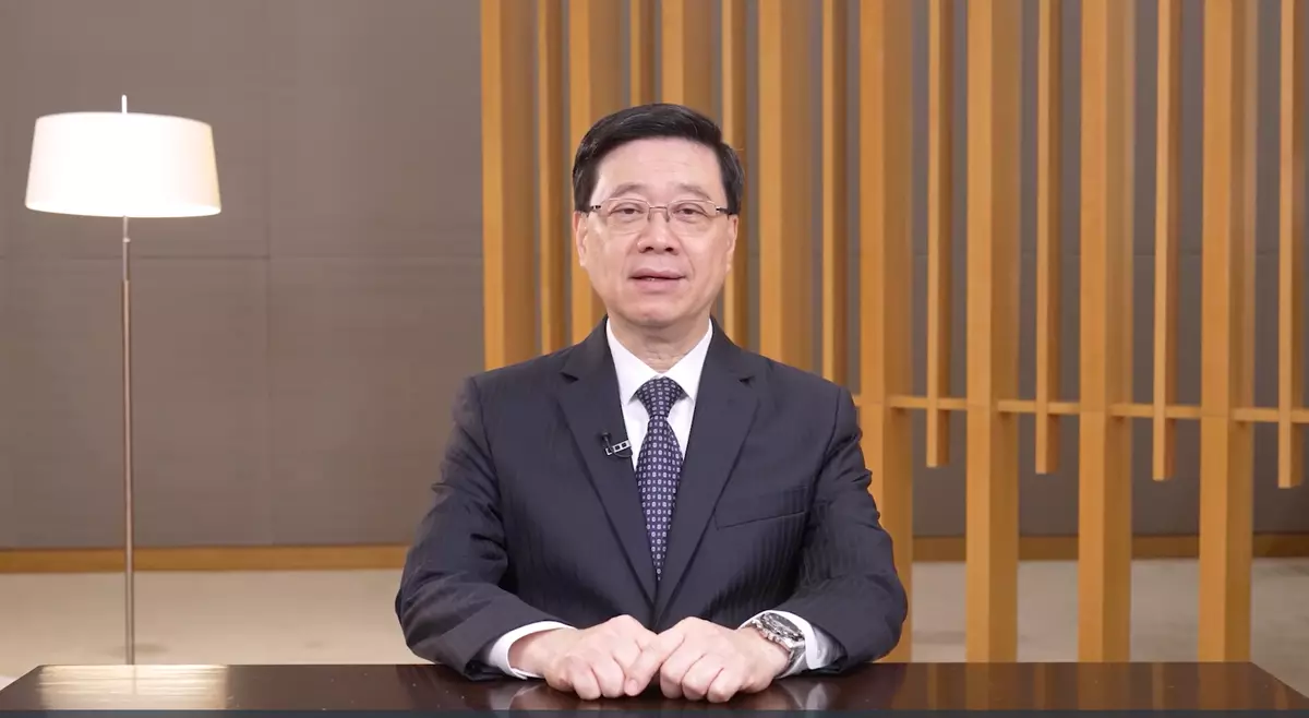 李家超在慶祝中國航天日10周年「善德關愛科研青年發展計劃——第八屆中國航天之旅北京、西安航天科技考察團」啟動禮的視像致辭。政府新聞處圖片