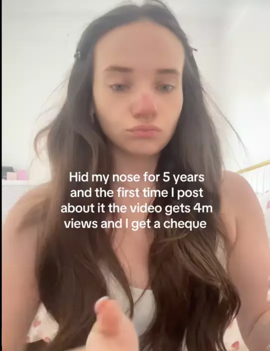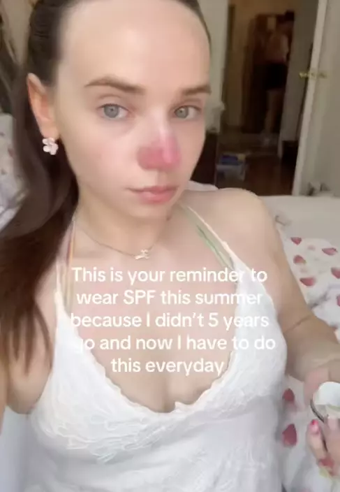 女子5年前在西班牙度假時曬傷,鼻子自此永久性發紅至今未癒。影片截圖