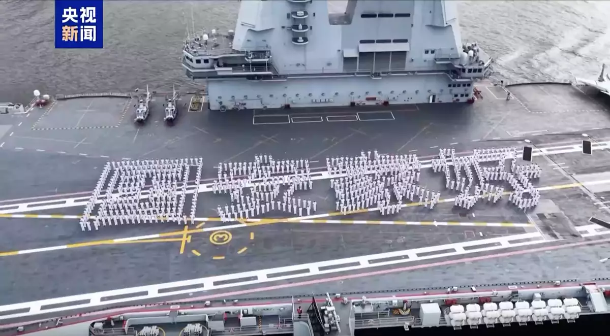 山東艦訪港,官兵甲板列隊「國安家好」方陣。央視新聞截圖