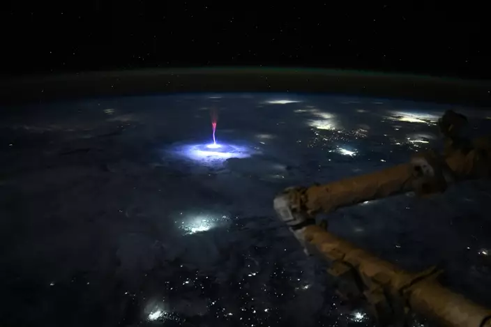 美國太空總署太空人日前在國際太空站上空,拍下一個巨大的紅色「水母精靈」(jellyfish sprite),自北美上空雷雨雲層中向上噴湧而出的壯觀畫面。